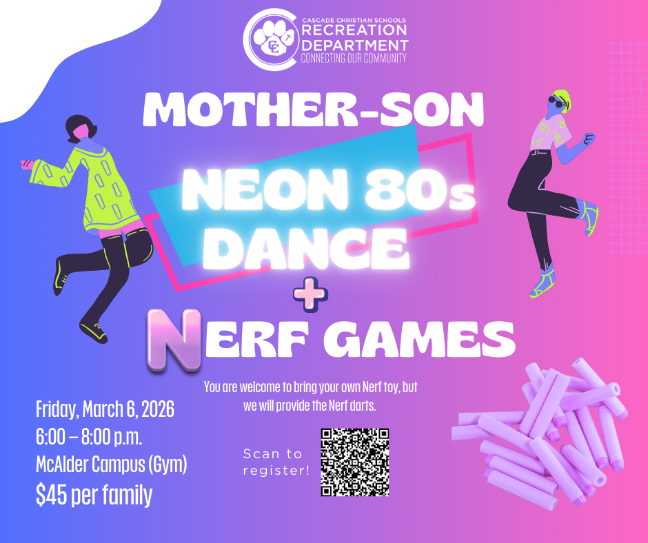 Mothers and their sons are invited to join us for the Mother-Son Neon 80s Dance and Nerf Games on March 6, 6:00-8:00 p.m.