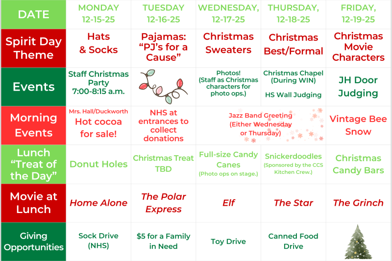 Here are the fun events coming up at the JH/HS during Christmas Spirit Week: